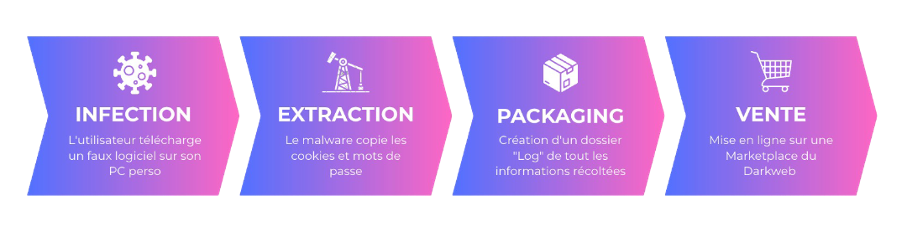 The business model is industrial. A “log” (the complete file of a victim or group of computers) generally sells for around $10. For this price, the buyer gains access to all accounts: Netflix, Facebook, and even their company’s VPN access.